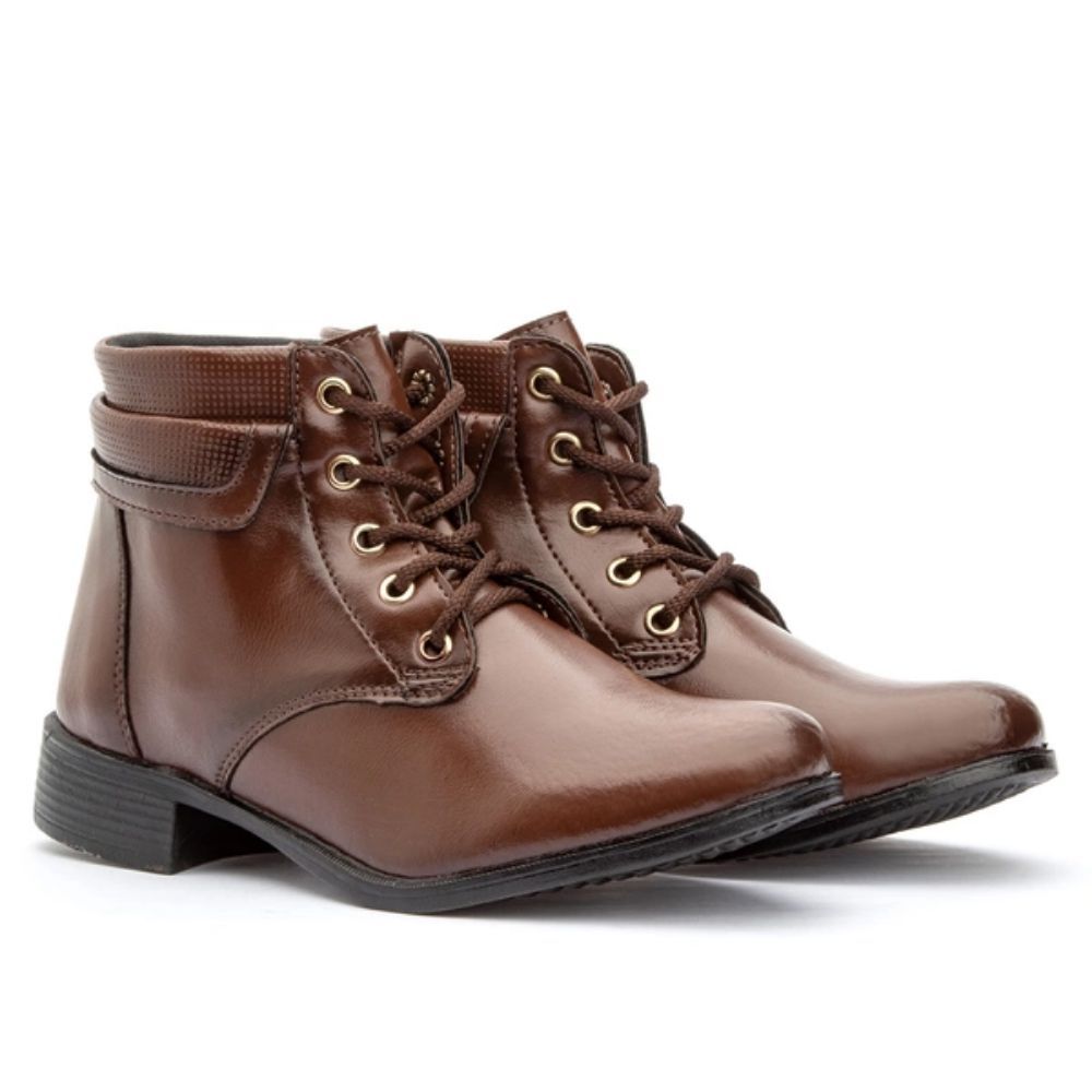 Conta com um fechamento em cadarço . A cor marrom e preto dá um contraste junto ao brilho do couro sintetico.