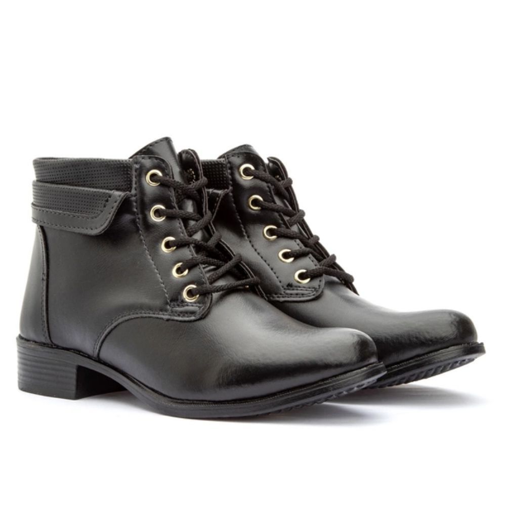 Conta com um fechamento em cadarço . A cor marrom e preto dá um contraste junto ao brilho do couro sintetico.